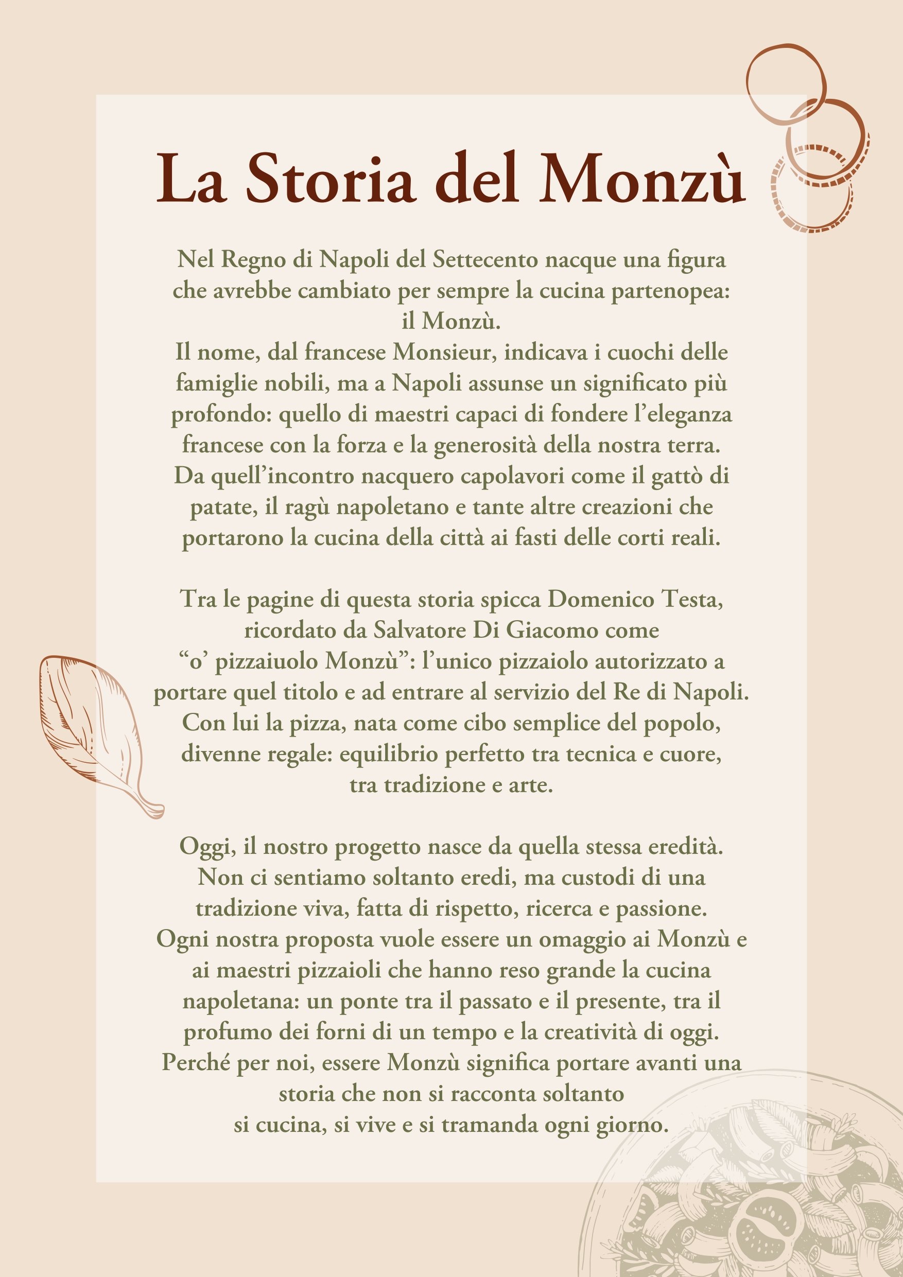 Nel cuore dei borghi casertani, Monzù celebra l’arte della cucina napoletana. Ogni piatto porta con sé la passione per la gastronomia napoletana e l’amore per i sapori genuini che ci raccontano la nostra storia., trasformando il semplice atto di mangiare in un viaggio nei sapori della nostra terra.